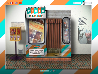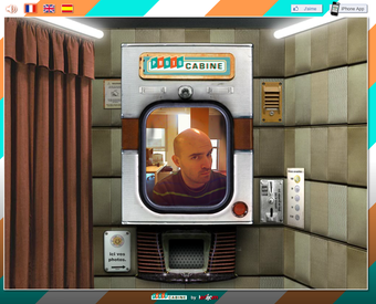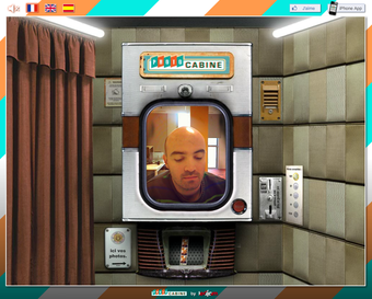 Photo Cabine se présente sous la forme d'un photomaton old school dans lequel on pénètre en passant un rideau. Tranquillement assis en face de votre écran et d'une webcam, vous n'avez qu'à ajuster la hauteur du siège et appuyer sur le bouton qui clignote pour déclencher 4 flashs successifs, espacés entre eux de 2 secondes à peine.